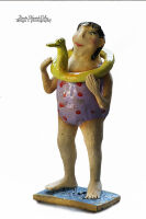 Ta ręcznie wykonana rzeźba z szamotu i kamionki przedstawia postać pływaka Jo w fioletowym stroju kąpielowym, dzierżącego żółtą kaczkę ratowniczą — symbol dziecięcej odwagi, humoru i surrealistycznej wyobraźni. Figurka łączy w sobie elementy art nouveau i współczesnej ceramiki artystycznej. Idealna jako dekoracja wnętrza, prezent dla kolekcjonera lub akcent w galerii sztuki.