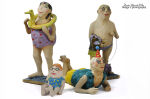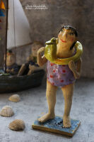 Pływak Jo w fioletowym kostiumie z żółtą kaczką ratowniczą – OOAK rzeźba ceramiczna