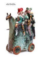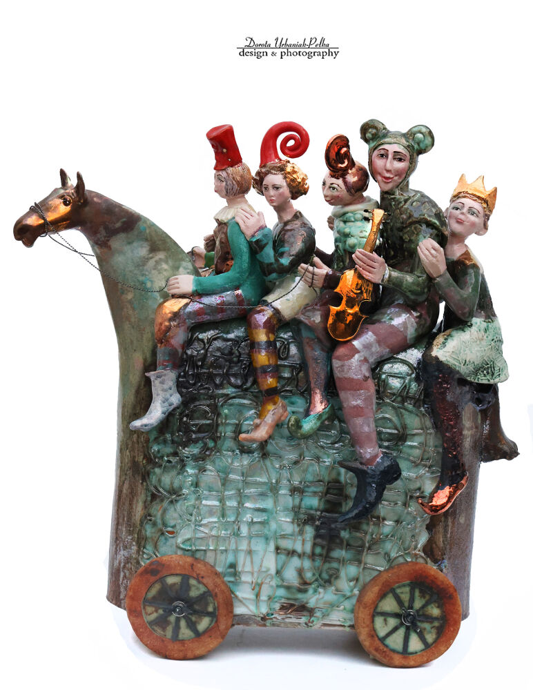 Ceramiczny koń z pięcioma postaciami . Ta unikatowa rzeźba należy do kolekcji Parallel World autorstwa Doroty Urbaniak‑Pełki, znanej z intuicyjnego podejścia do ceramiki i subtelnych, surrealistycznych opowieści tworzonych formą.
