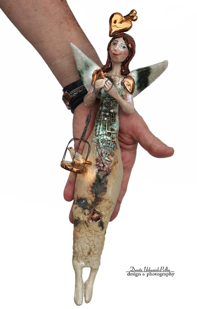 Poznaj Anioła z Ptakiem w Klatce – wyjątkową, ręcznie modelowaną ceramiczną rzeźbę ścienną, która powstała z połączenia intuicji, ognia i wyobraźni. Jego spokojne spojrzenie, złote skrzydła i symboliczna klatka z ptakiem tworzą opowieść o wolności, delikatności i wewnętrznej harmonii.