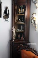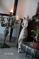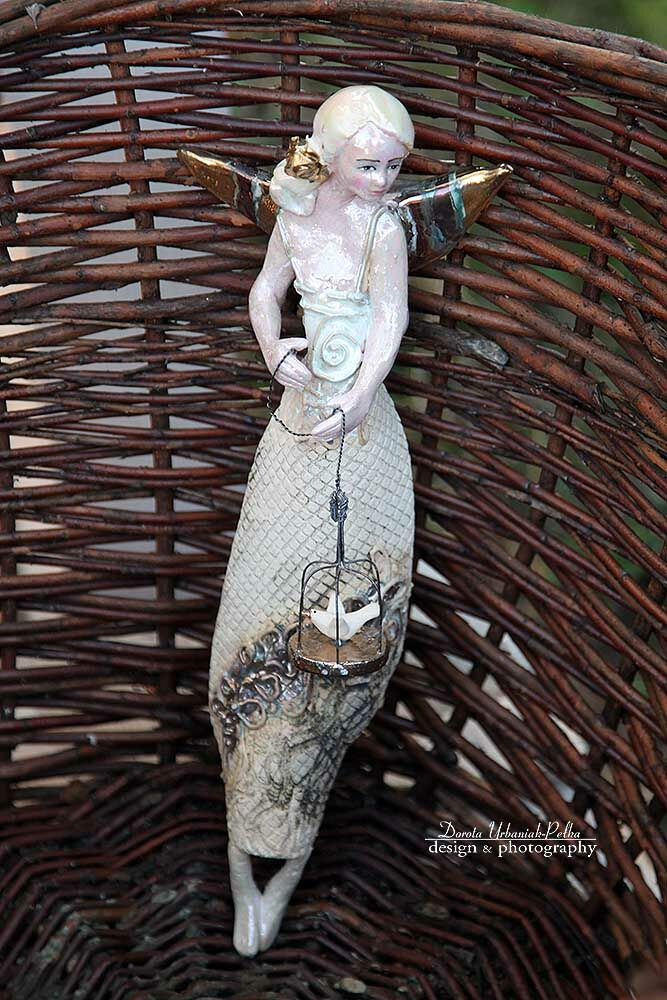 Skrzydła , klatka i kwiat we włosach szkliwione złotem.