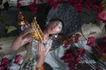 Surowość karbowanej szaty, ozdobionej delikatnymi śladami błyszczących zdobień, kontrastuje z błyszczącymi skrzydełkami, które odbijają światło i nadają rzeźbie blasku i elegancji.