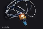 Zawieszony na organzie koloru białego oraz granatu (wzmocnienie z białego sznurka jubilerskiego 1 mm) o długości 70 cm.