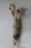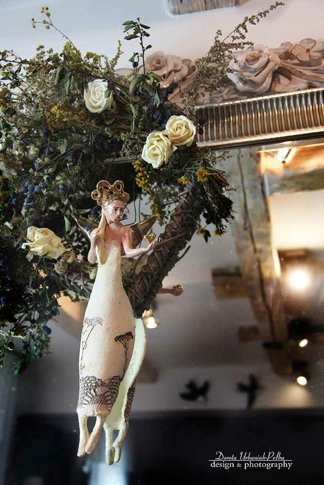 Skrzydła,  serce na dłoni oraz wianek na głowie  szkliwione złotem.