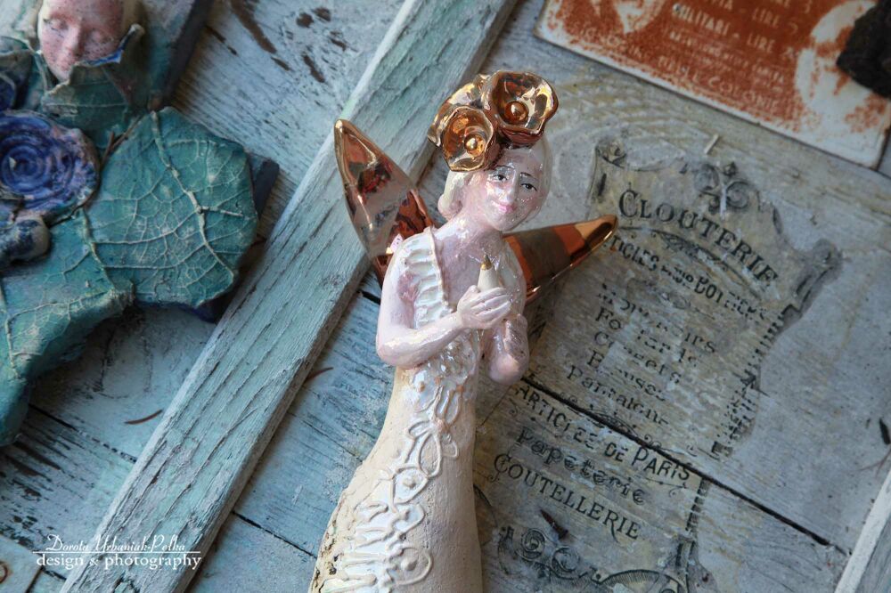 Skrzydła , NAKRYCIE GŁOWY oraz DZIUBEK PTASZKA szkliwione miedzią oraz złotem.