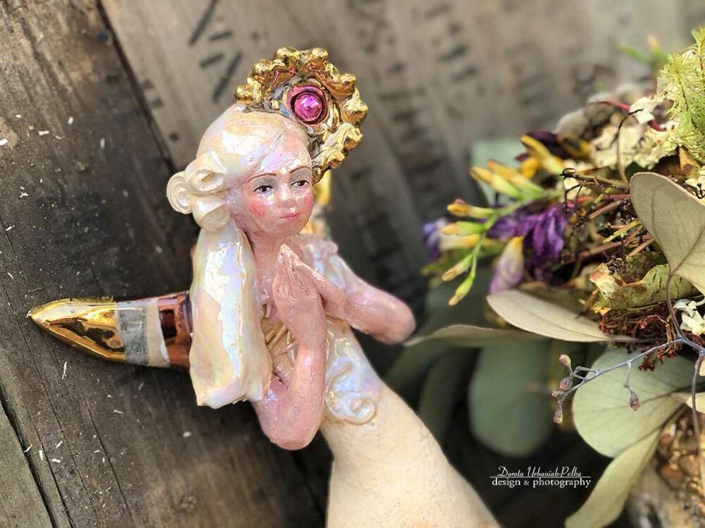 Skrzydła oraz nakrycie głowy miedzią oraz złotem.