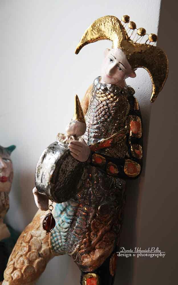 Czapka, buty oraz detale szkliwione złotem.