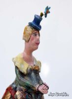 Kwiat na kapeluszu osadzony na metalowym drucie.