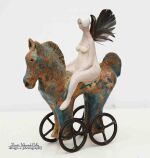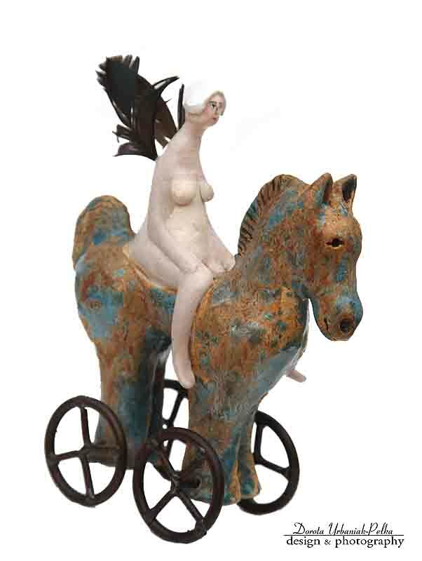 KOŃ WSPARTY NA STALOWYCH NIERUCHOMYCH KOŁACH.