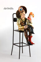Figurka przedstawia ceramiczne postacie na metalowym krześle.